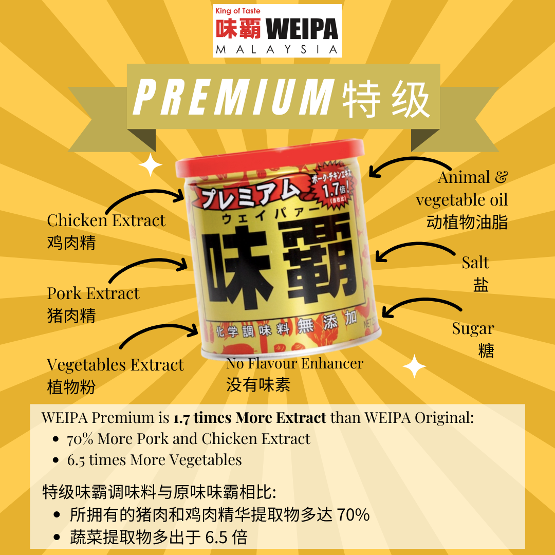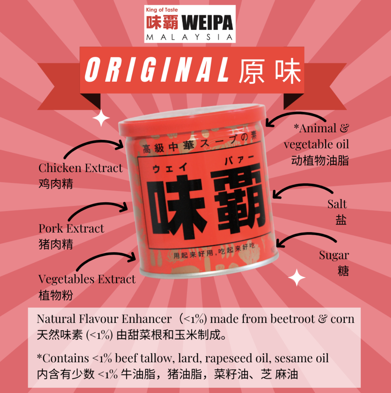 WEIPA Original is a food seasoning made from fresh vegetables, chicken and pork extracts (Non-Halal). There are other spices added that brings a rich taste and aroma to any cooked dish.