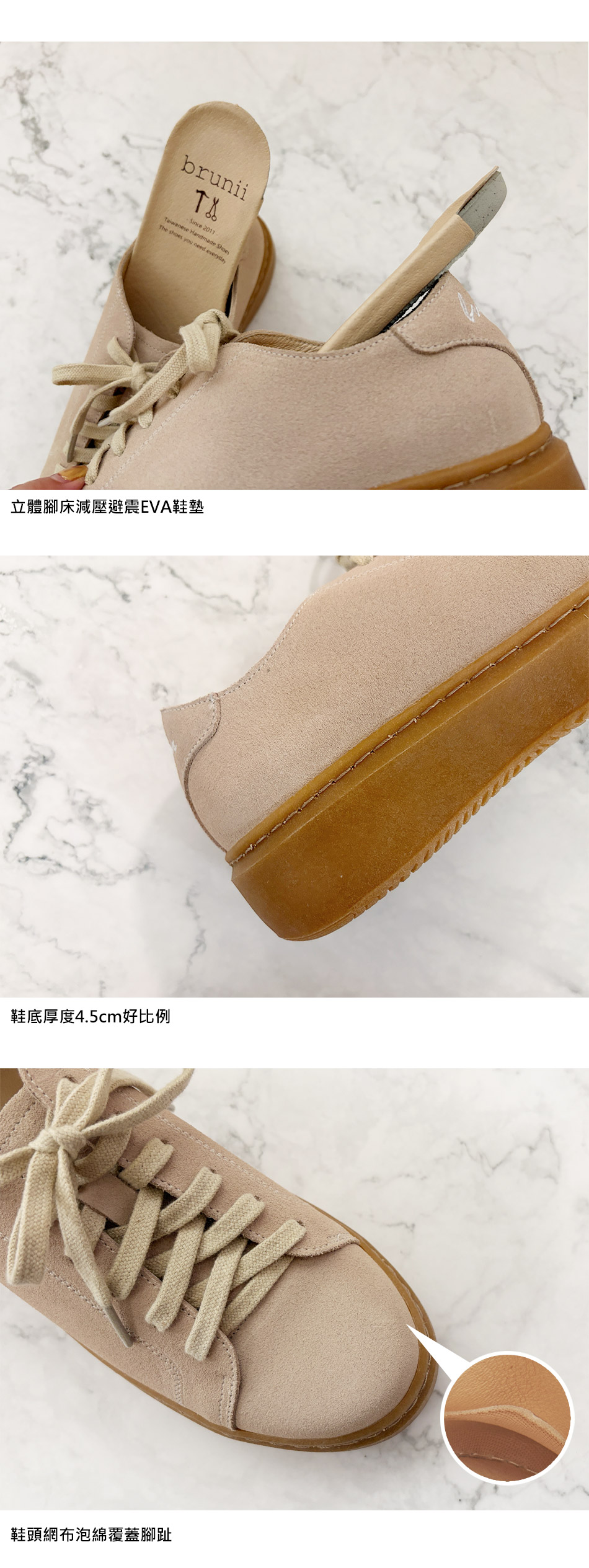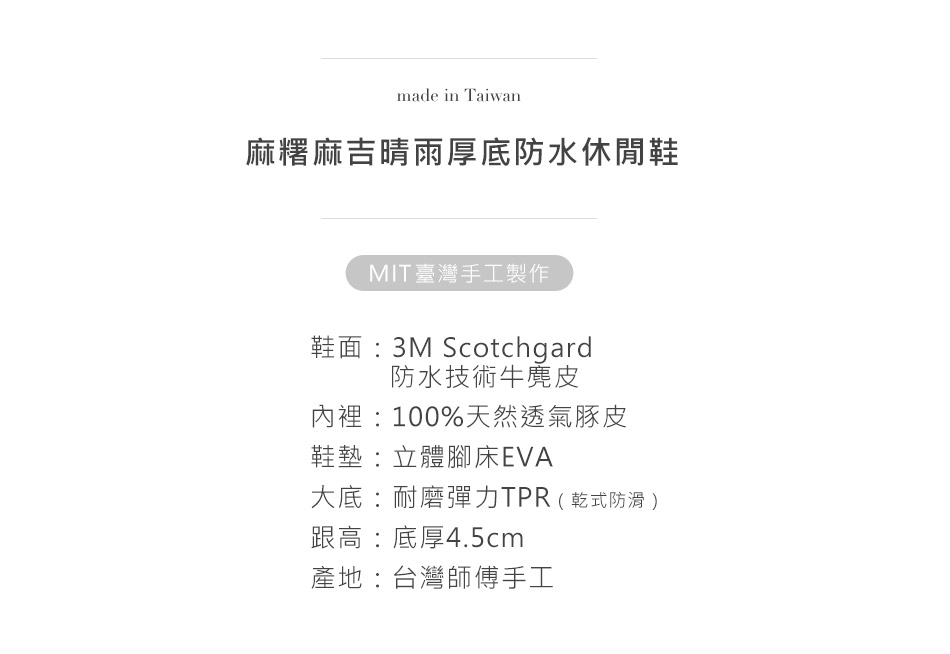 。立體腳床減壓鞋墊。鞋底加厚4.5cm。鞋頭可立可多包覆腳趾。3M防水技術牛絨皮。台灣老師傅手工真皮鞋