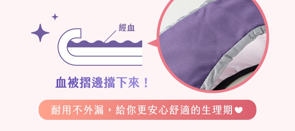 月亮褲® 獨創紫色布料親膚層,透過不顯紅的紫色,細緻柔滑的細丹尼纖維觸感,經血吸收狀況一目瞭然!