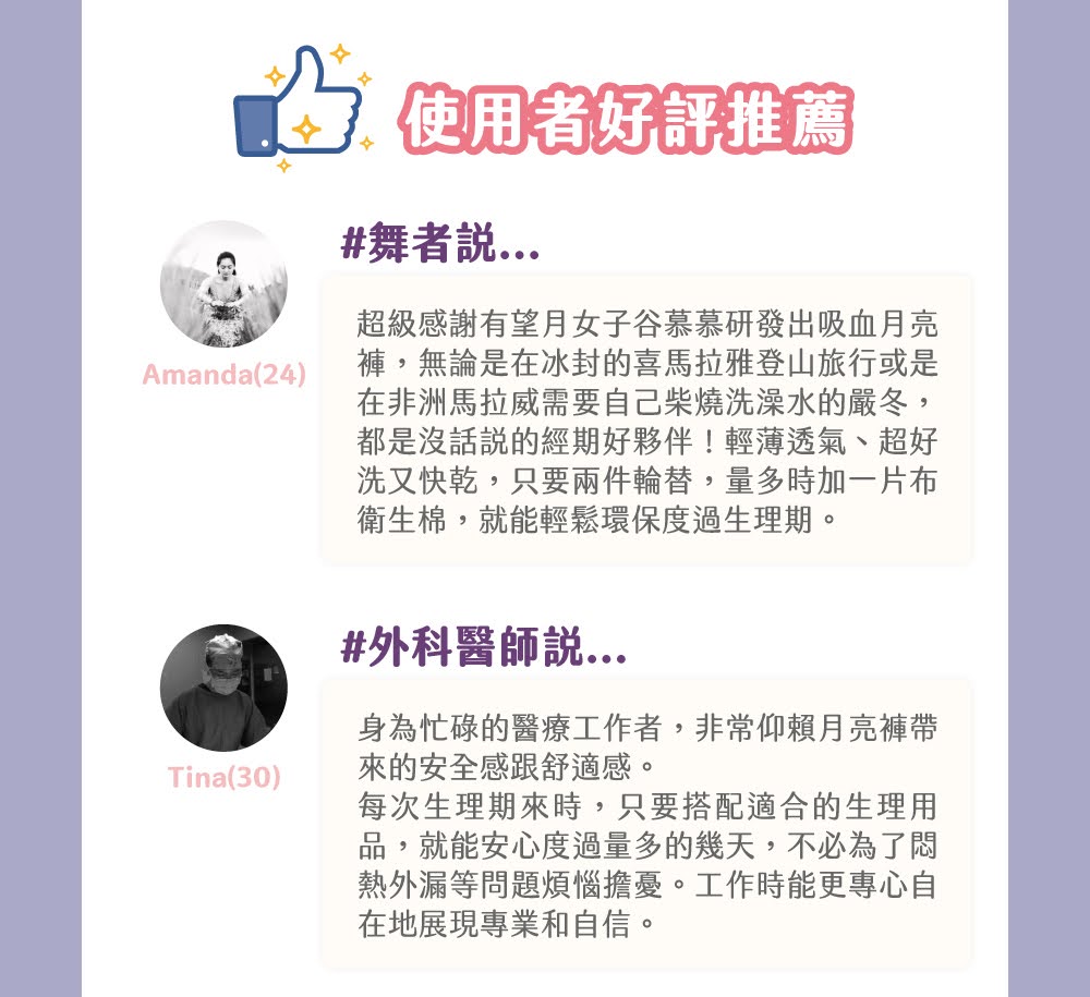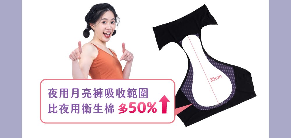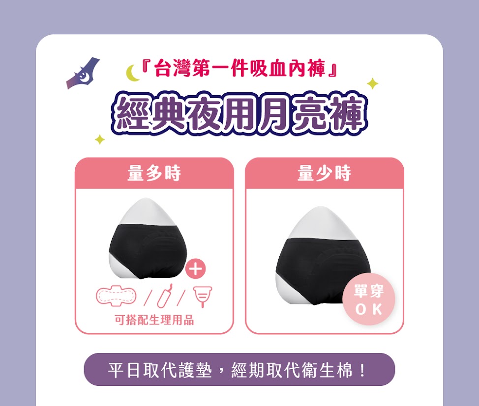 A:一般生理褲只有防漏的功能,月亮褲則是有吸收排汗的功能,可完全取代衛生棉,而不會悶熱,讓你安心每個月的內褲。