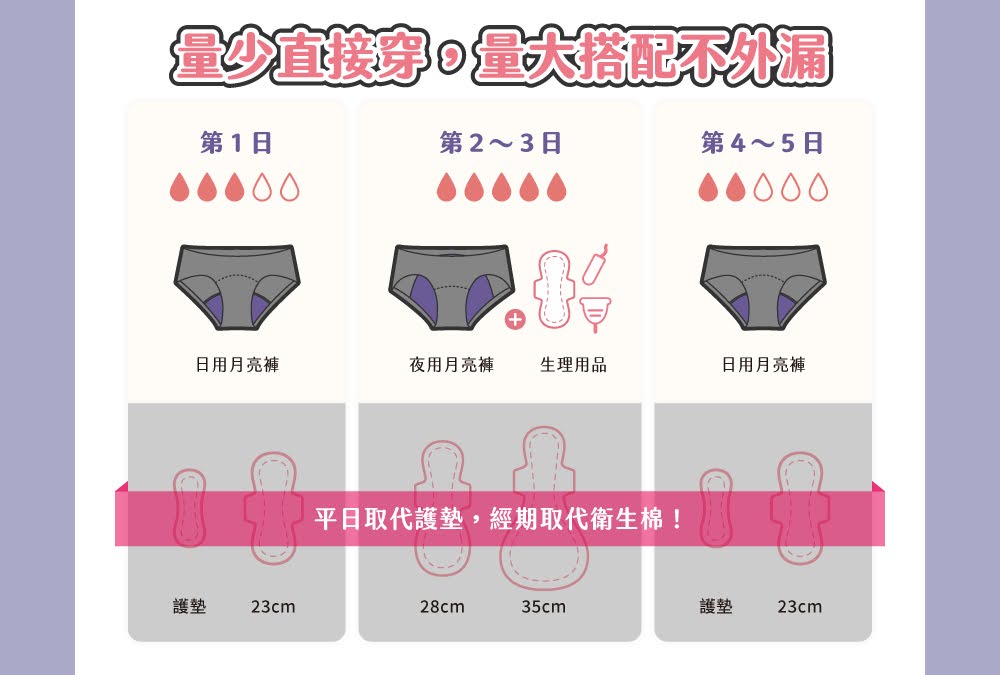 A:量少的幾天可以不用更換穿一整天,量多的時候則需要更換,大約一天需要2-3件,視個人的量而定。