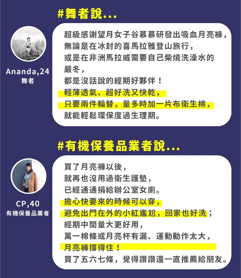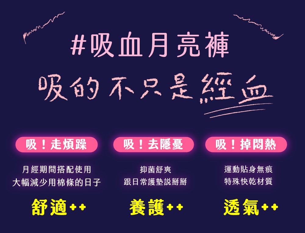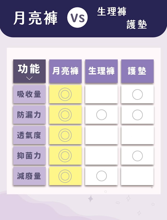 A:一般生理褲只有防漏的功能,月亮褲則是有吸收排汗的功能,可完全取代衛生棉,而不會悶熱。